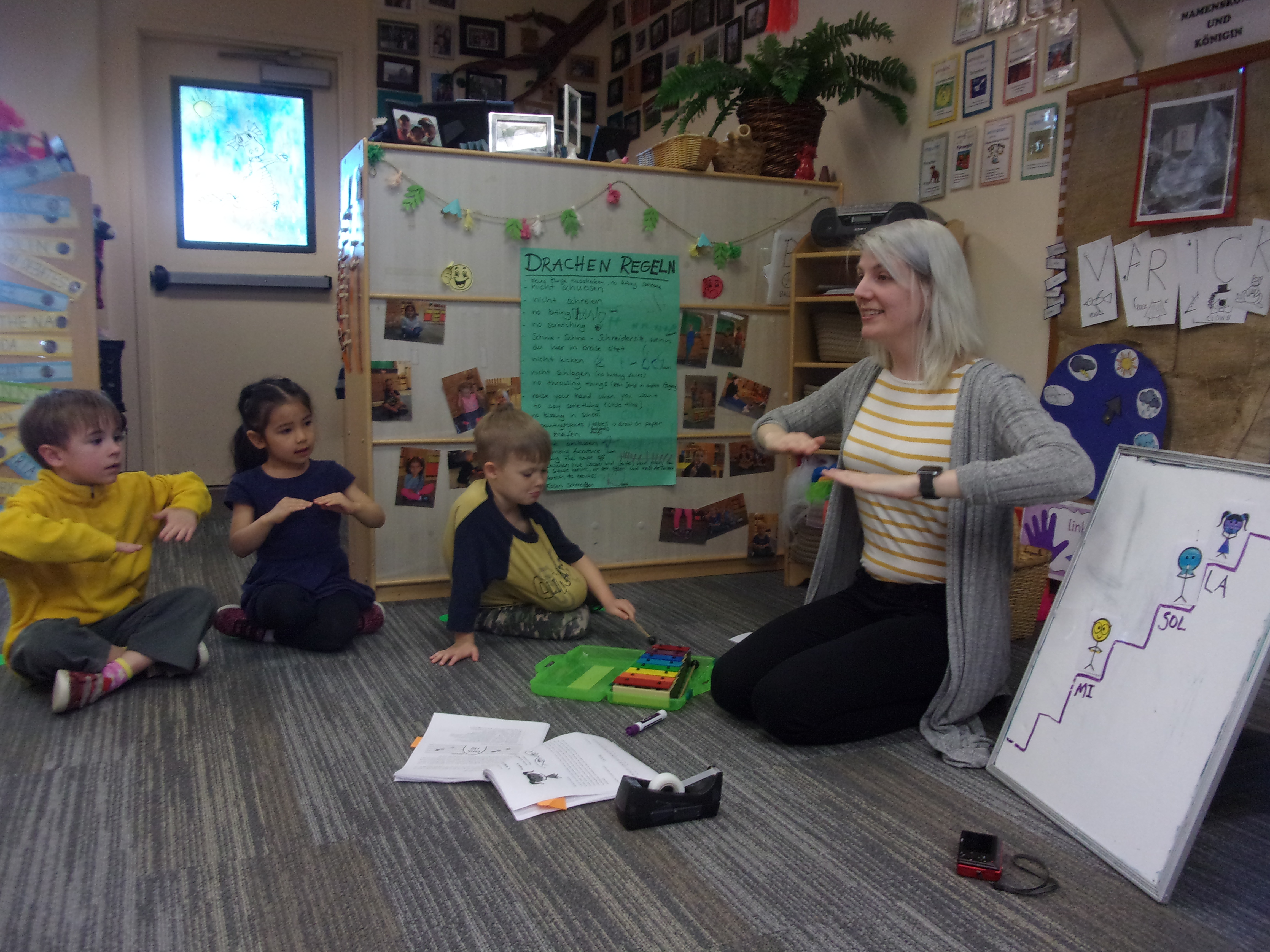 We kicked off the school year with a unit on steady beat and rhythm. The kids got their hands on a variety of rhythm instruments including drums, shakers, jingle bells, and rhythm sticks. Just in time for Halloween, we learned a series of spooky games and songs that also encompass musical concepts. For example, with the rhythm sticks, we told stories about witches in the forest who make music with their brooms. Through this Besenmusik (broom music), the children learned to recognize and reproduce rhythmic patterns.